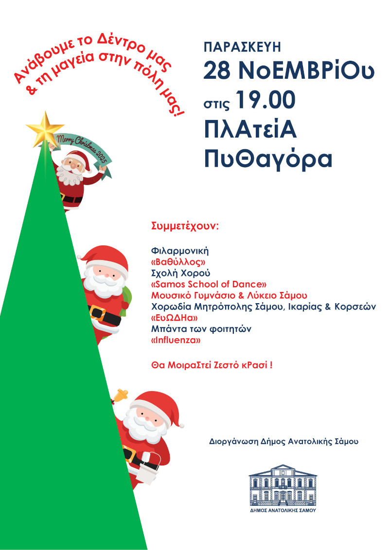 Ο Δήμος Ανατολικής Σάμου προσκαλεί μικρούς και μεγάλους στο άναμμα του Χριστουγεννιάτικου Δέντρου, δίνοντας το σύνθημα για να γεμίσει η πόλη φως, χρώματα και γιορτινή διάθεση.