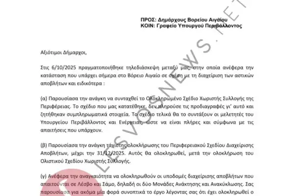 Η επίμαχη επιστολή, με ημερομηνία 10/10/2025 και αριθμό πρωτοκόλλου ΥΠΕΝ/ΓΓΣΑ/111149/2819, απευθύνεται στους Δημάρχους του Βορείου Αιγαίου και περιγράφει με σαφήνεια όσα συζητήθηκαν σε τηλεδιάσκεψη που πραγματοποιήθηκε στις 6/10/2025. Κατά τη διάρκεια της τηλεδιάσκεψης, τέθηκε ρητά το θέμα της ολοκλήρωσης των υποδομών διαχείρισης αποβλήτων στη Λέσβο και τη Σάμο — δηλαδή, των δύο Μονάδων Ανάκτησης και Ανακύκλωσης.