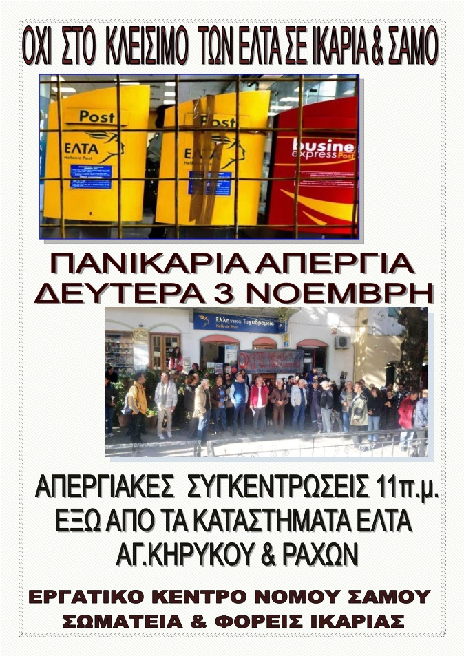 Το Εργατικό Κέντρο καταγγέλλει την απόφαση της Διοίκησης των ΕΛΤΑ να αναστείλει πανελλαδικά τη λειτουργία σειράς καταστημάτων εξυπηρέτησης κοινού — δηλαδή ουσιαστικά να βάλει λουκέτο — μεταξύ αυτών και στη Σάμο (κατάστημα Πυθαγορείου) καθώς και στην Ικαρία (καταστήματα Ραχών και Αγίου Κηρύκου).